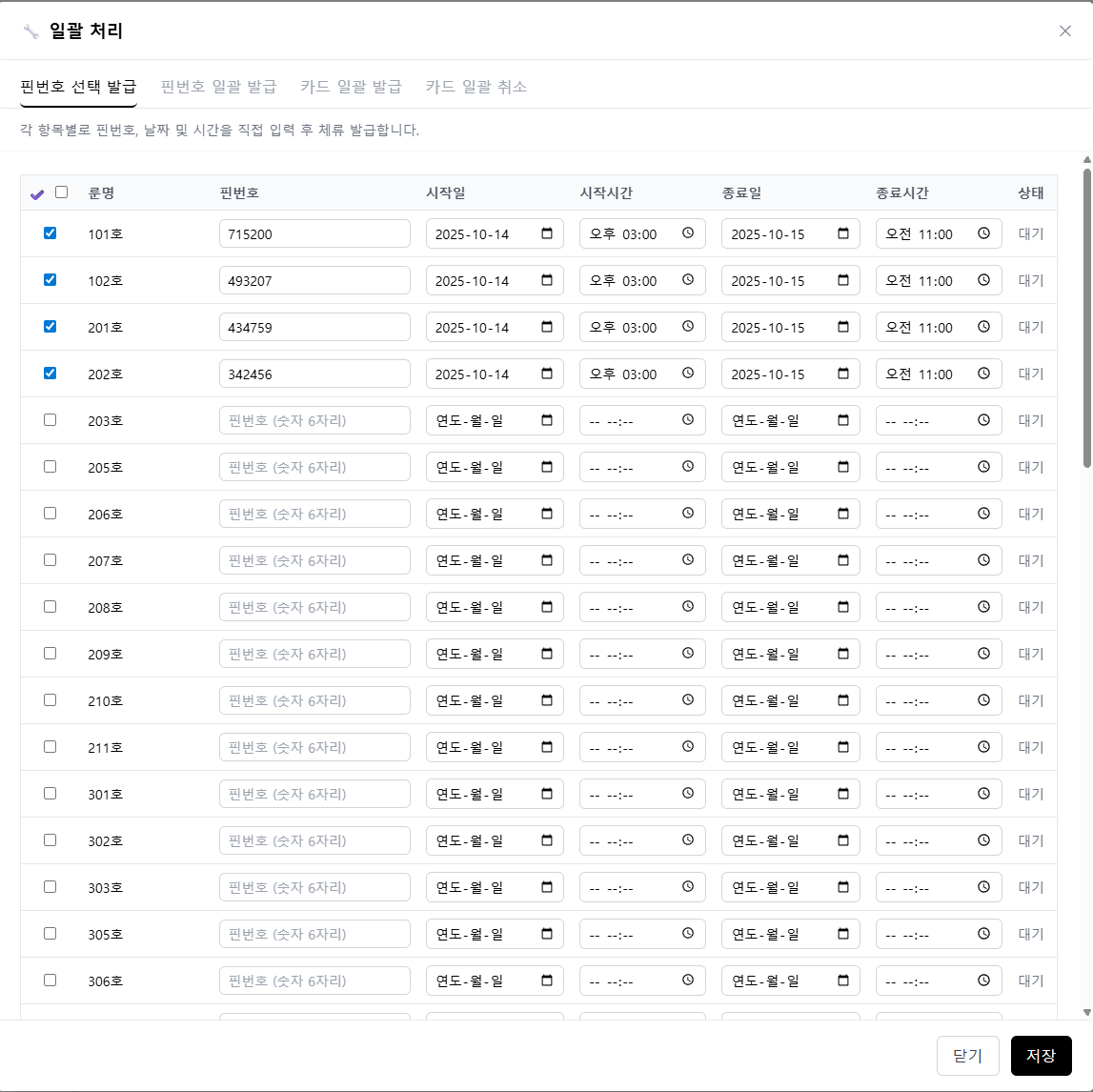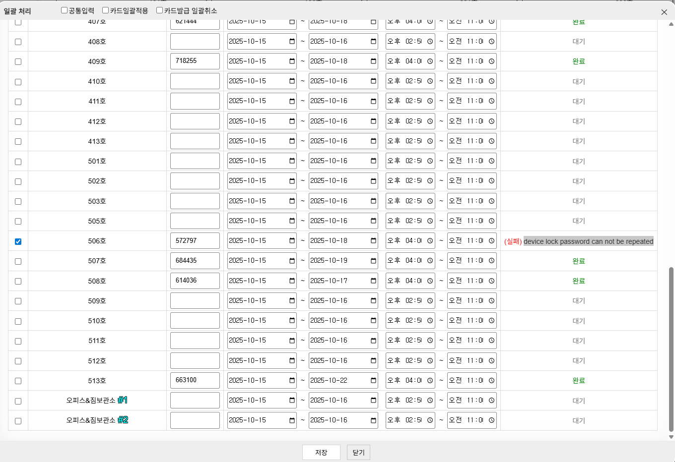 - 저번에 말씀해 주셨지만 발급완료 되었다는 창이 보이지 않는다면 해당 객실이 발급 되었는지 확인이 필요합니다 그리고 창이 자동으로 꺼지지 않았으면 합니다 결국은 저희가 비밀번호를 일일이 복사하기 때문에 발급이 되고도 해당 창이 꺼지지 않았으면 하고 버젼 1과 같이 상태 표시가 있으면 좋겠습니다 오류 표시도 1과 같이 동일하게 가능할까요?