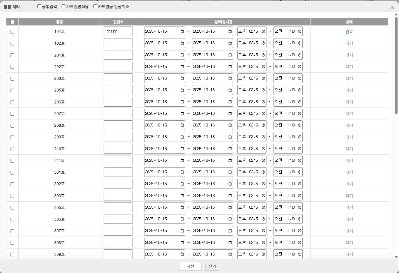 - 저번에 말씀해 주셨지만 발급완료 되었다는 창이 보이지 않는다면 해당 객실이 발급 되었는지 확인이 필요합니다 그리고 창이 자동으로 꺼지지 않았으면 합니다 결국은 저희가 비밀번호를 일일이 복사하기 때문에 발급이 되고도 해당 창이 꺼지지 않았으면 하고 버젼 1과 같이 상태 표시가 있으면 좋겠습니다 오류 표시도 1과 같이 동일하게 가능할까요? -> 이해했습니다.